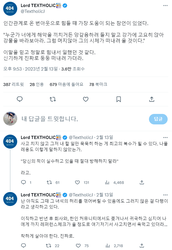 사실 앙갚음하지 말고 강가에 고요히 앉아 강물을 바라보라는 그 잠언의 원전은 굳이 찾고 싶었어도 결국은 찾지 못했다만,